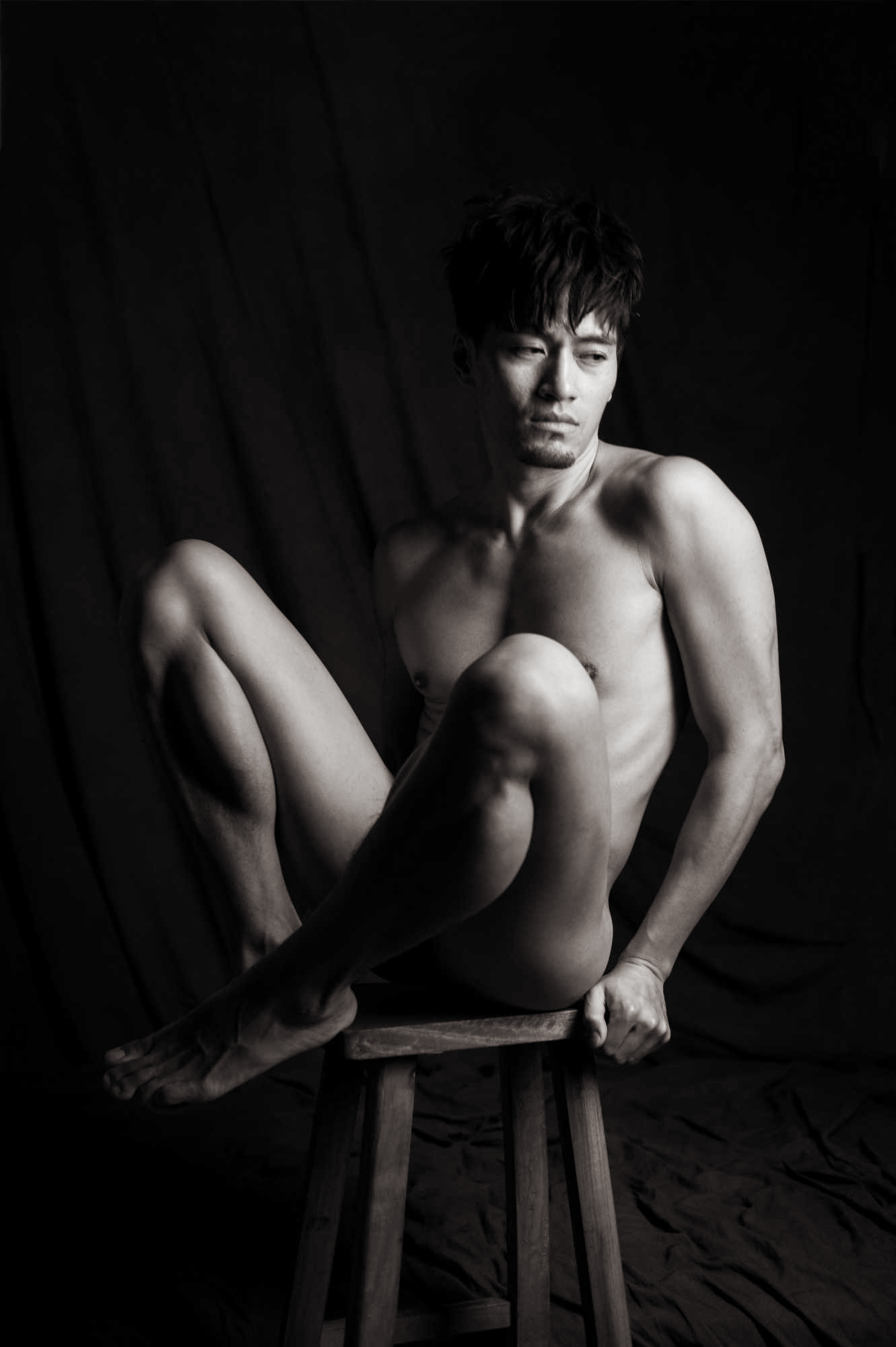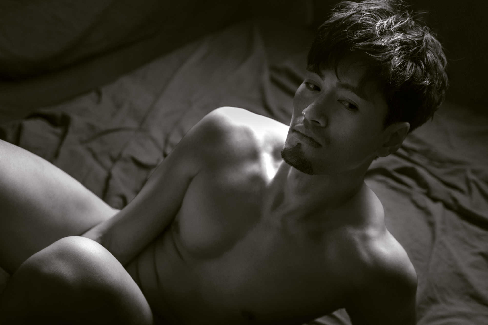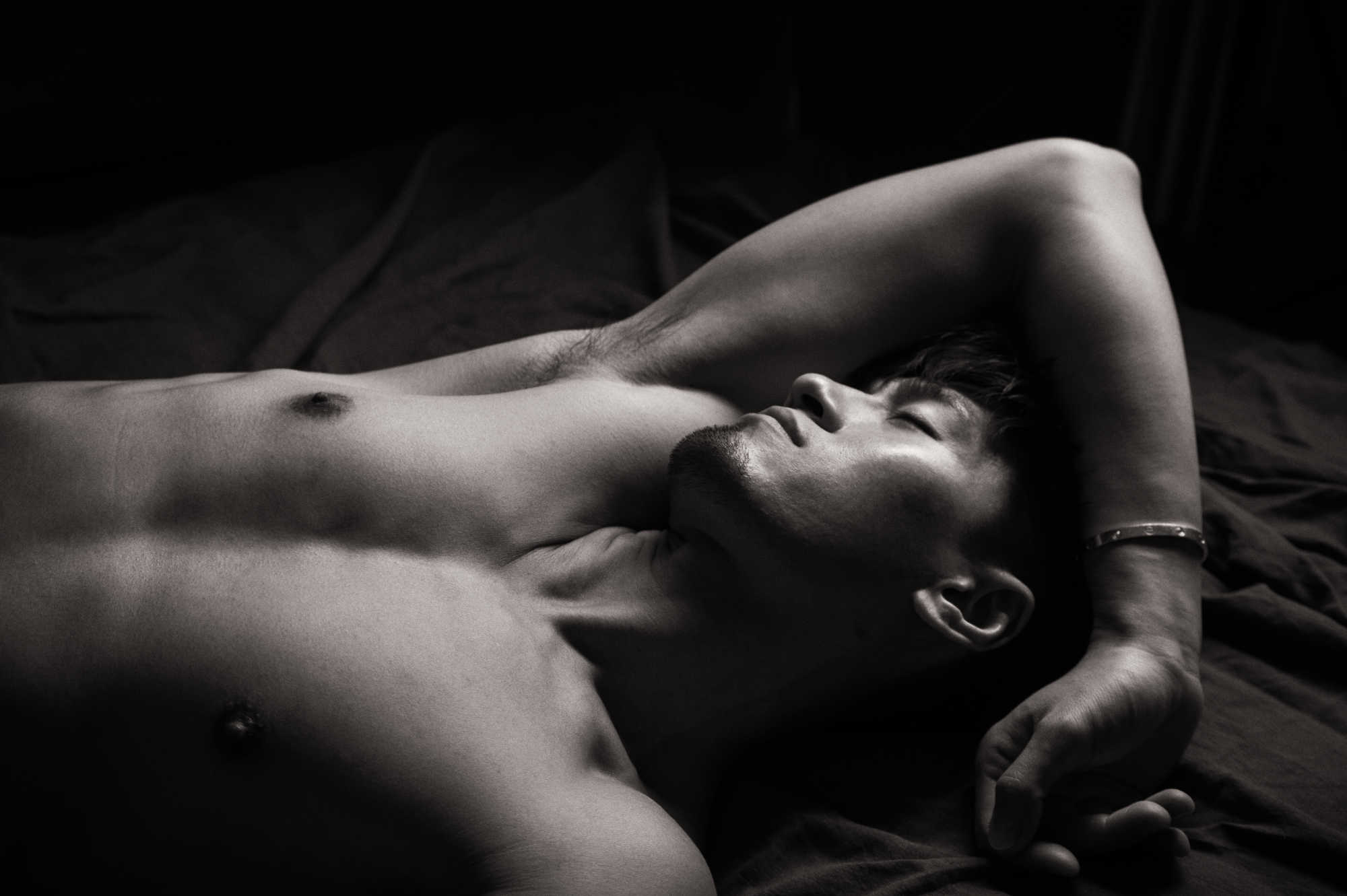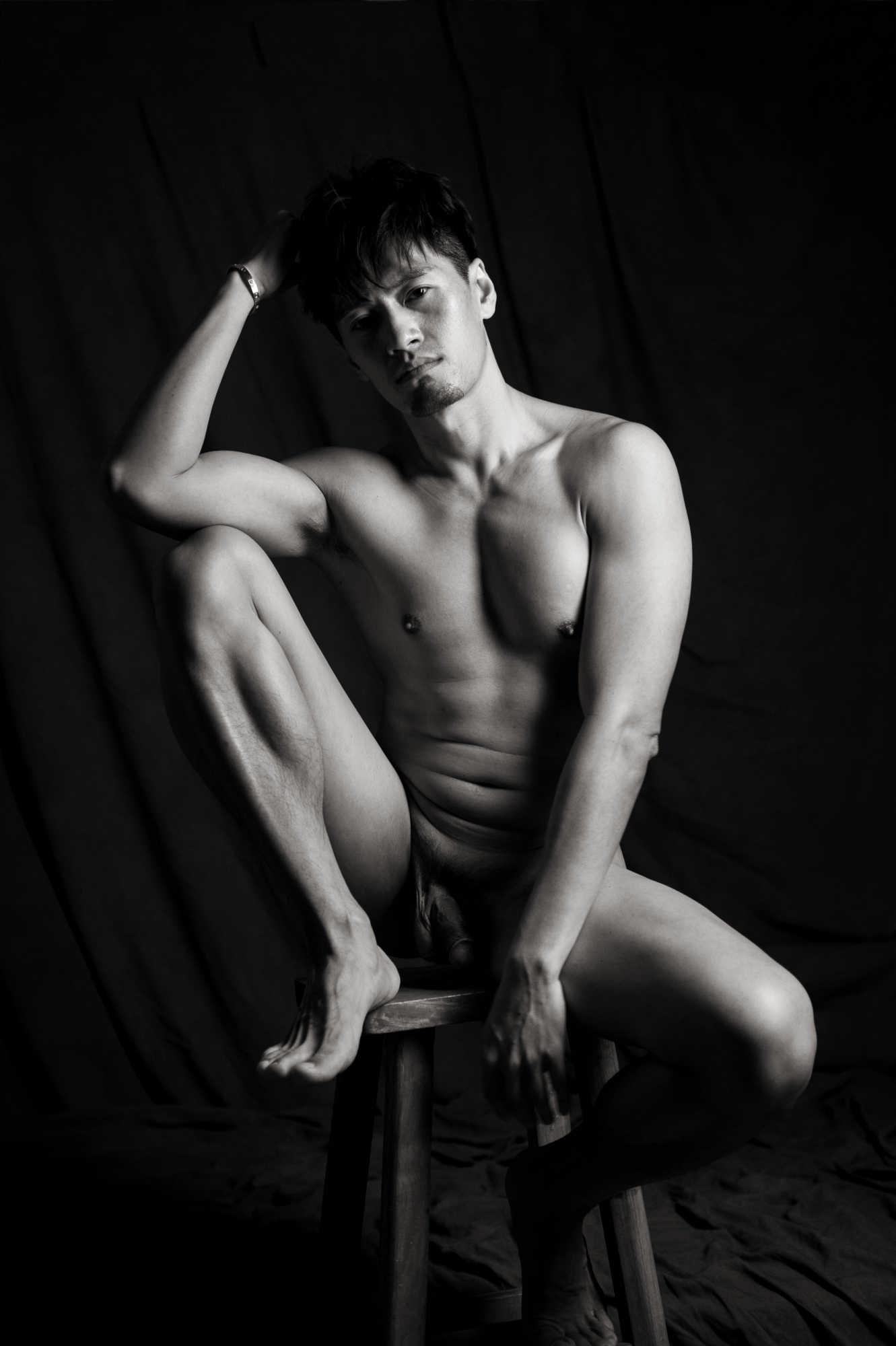 Photographed in 2016, I met Pop through social media channels. I believe I commented that he was very handsome, to which he modestly agreed. Originally from Taiwan, we agreed to a shoot in the studio using a mattress and dark draping material. With masculine handsome features not shy of showing it all, we seemed to make some beautiful images together.